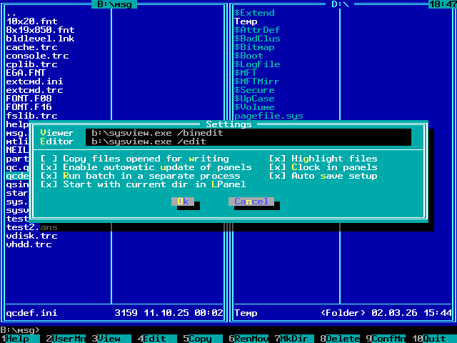 Долго собирался с силами, чтобы написать это, на самом деле ... Есть куча всяческих клонов NC - Far, MC, FC, итд, итп ... Но, поскольку прямое портирование или запуск любого из них были довольно затруднительны - пришлось написать свой ;) За образец для клонирования брался Far нулевых годов и результат вполне способен облегчить бытовые потребности - копирование, удаление, подсчёт размера, вызов вьюера / редактора, меню, традиционные панели, итд ... Внутри себя он работает в юникоде, поэтому, даже если каталоги и имена файлов полны страшных знаков вопроса - они мирно скопируются на любой FAT/exFAT, длинные имена которых тоже в юникоде. Выглядит оно примерно так: